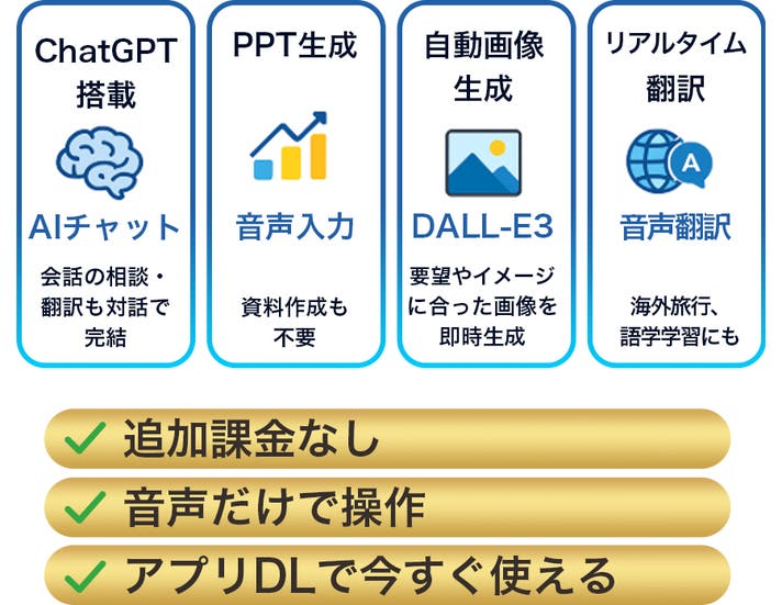 A:メール作成、音声による文字入力、翻訳、プレゼン資料の作成、Web検索、会議の議事録作成など、幅広い業務に対応できます。