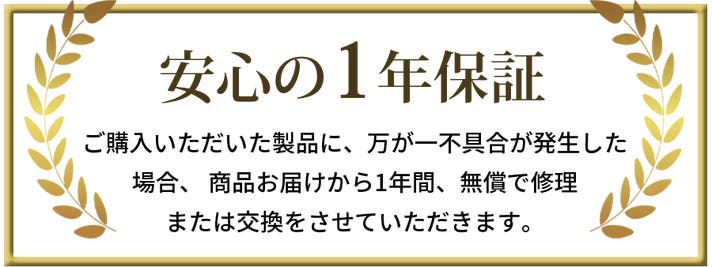 A:当社製品は、初期不良や製造上の欠陥に限り、商品お届け日から1年間保証いたします。