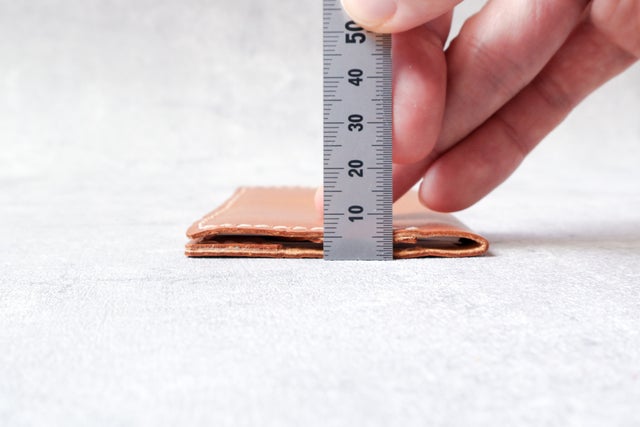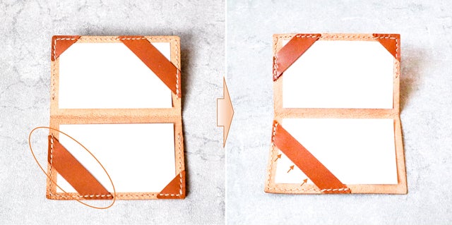 自分用/お客様用でカードポケットを分ける機能をそのままに、仕切りのデザインを工夫することで革の重なりを3枚分にすることを実現。わずか4mmの厚みに抑えることに成功しました。