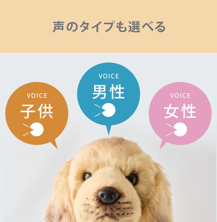 AIDogは、子ども声・男性声・女性声の3種類に切り替え可能。ご利用シーンやお好みに合わせて、声を選ぶことができます。