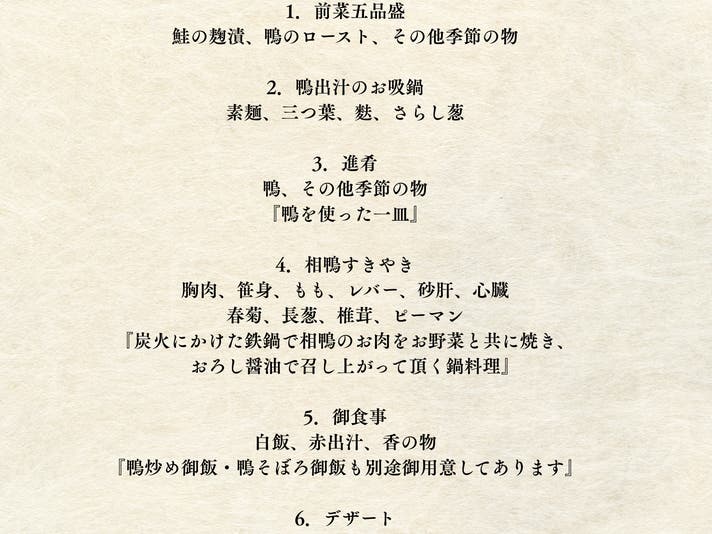 【相鴨すき焼きコース お品書き】