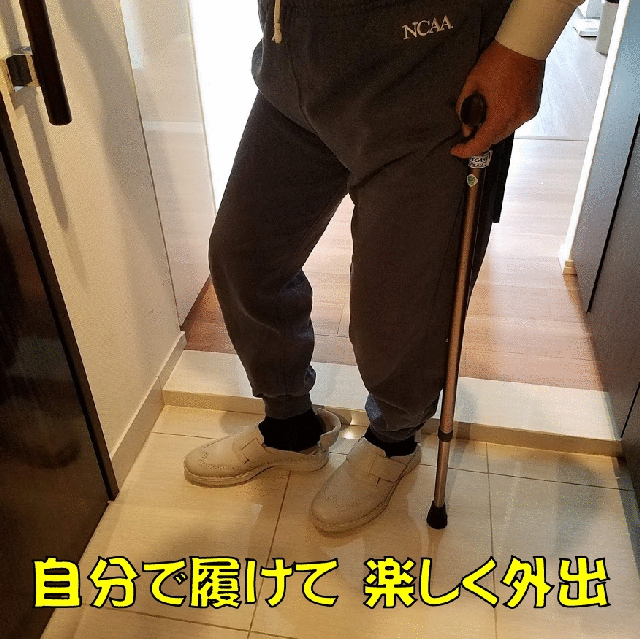 自宅で、施設で、病院で、介助不要で職員の手を煩わせません。ベットから起きて素足でも気軽に履けます。