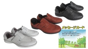 楽靴(らっく)にメッセージカードを添えてお送りいたします。