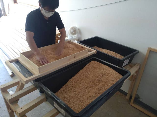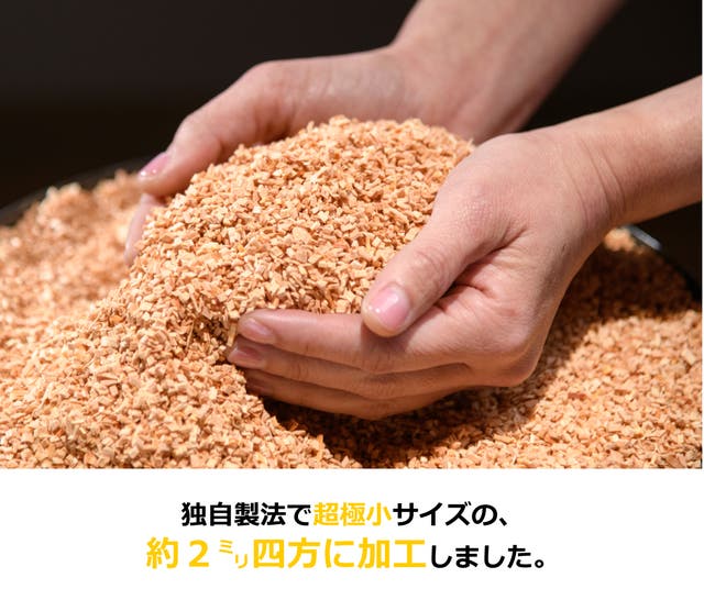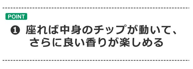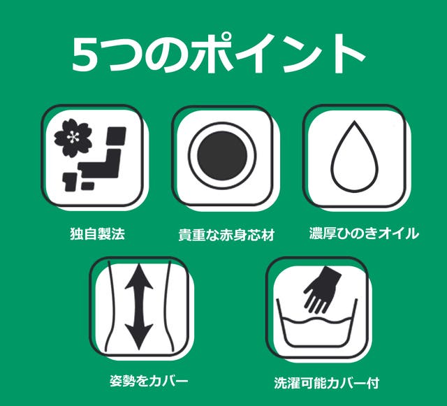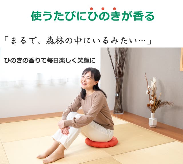 - ひのきの精油成分が多い赤身芯材を、独自製法で約2㍉四方に加工。座っても凹凸感が小さく香りが高い