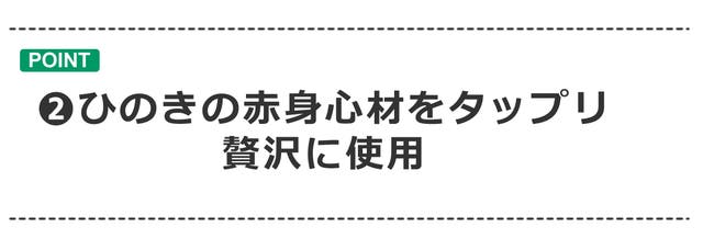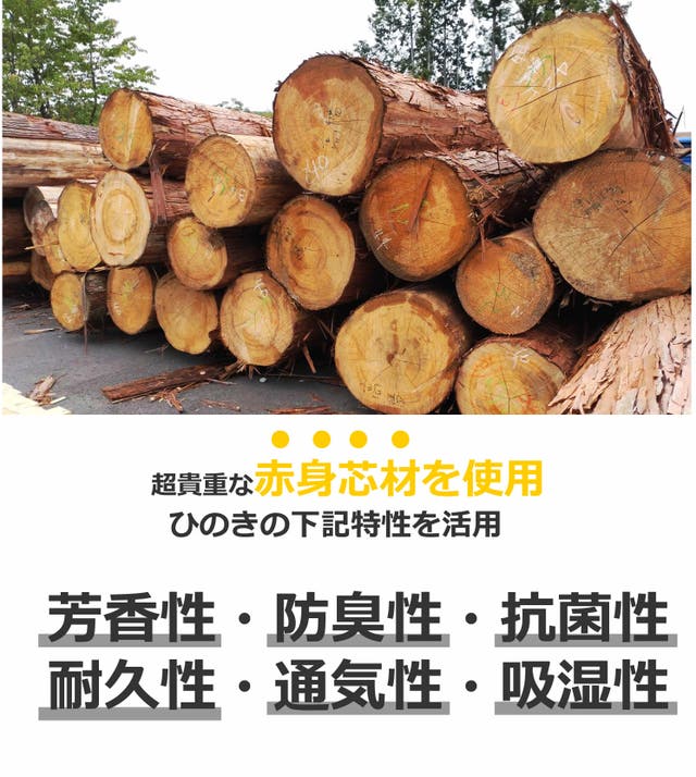 - ひのきの芳香性、防臭性、抗菌性、耐久性、通気性、吸湿性を取り入れ、まるで1日森林の中
