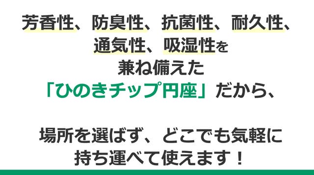 「円座として使用」はもちろんの事、ひのきが持つ「芳香性、防臭性、抗菌性、耐久性、通気性、吸湿性」を取り入れた新感覚の円座です。