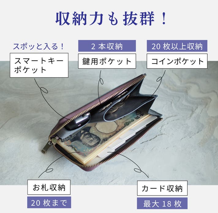 収納量:鍵2本・スマートキー1個・カード18枚・コイン約20枚・紙幣20枚