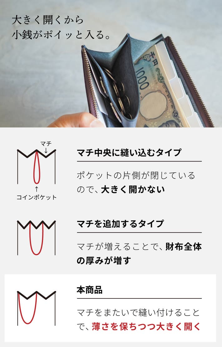財布の構造でよく見かける【小銭入れのためのマチ】を設けるのではなく、財布全体のマチを小銭入れのマチとして共有してしまうことで、財布全体の厚みを増やさずに大きく開くポケットの仕様になりました。