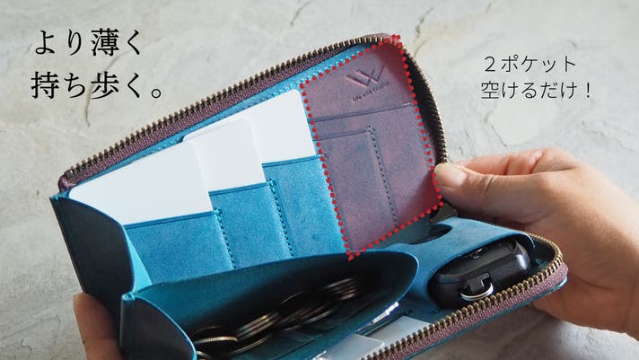 収納したいカードの枚数が少ない人は、スマートキーの向かい側のカードポケット2枚分を空けておくと、財布をより薄く持ち歩けます!