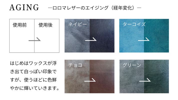 使うほどに美しさを増すロロマレザーは、「長く愛せるモノ」として育てていただける革です。