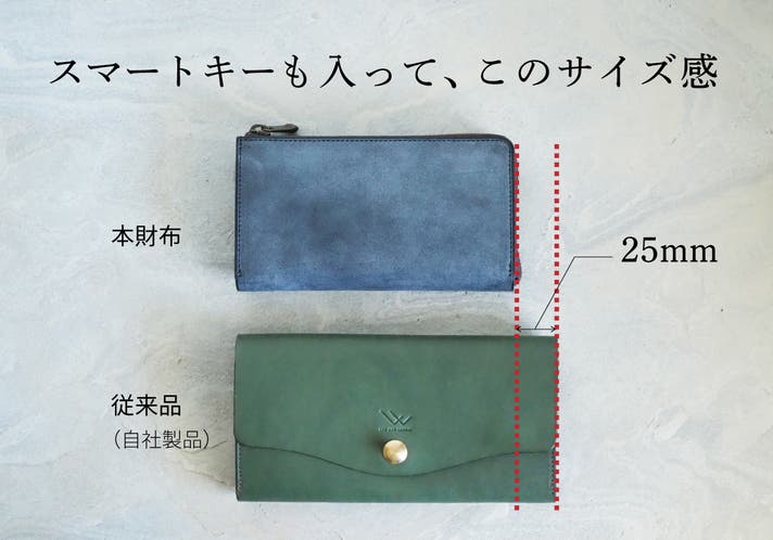 サイズ感は、一般的な長財布と比べて25mmも小さくなりました!