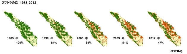 東南アジアのスマトラ島は、日本の面積の約1.25倍にもなる、世界で6番目に大きな島です。かつて島全体を覆っていた熱帯林が、急激に失われています。とりわけ、過去25年間の減少が著しく、1985年から2012年にかけて、半分以上の森林が消滅しました。島に広がる低地の熱帯林は、今のまま伐採が進んだ場合、近い将来に消滅すると危惧されています。