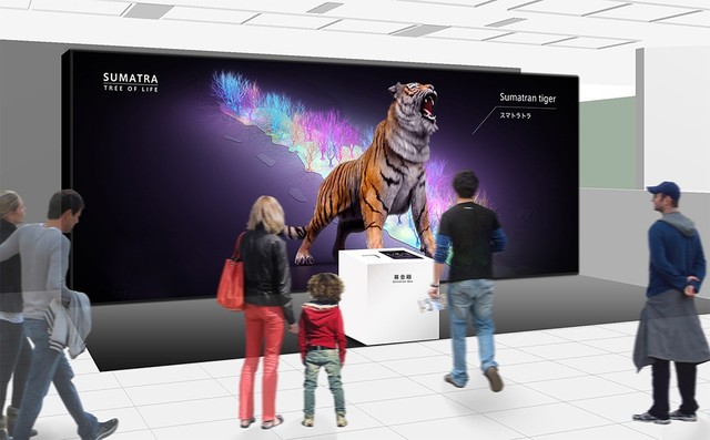 チャリティ募金イベントのメイン会場となる東京・銀座のソニービルでは、1Fエントランスホールに設置する募金箱で募金をしていただくと、スマトラを代表する動物達(スマトラゾウ、スマトラサイ、スマトラトラ)が巨大モニター内で動き始める「SUMATRA -TREE OF LIFE-」をでお楽しみいただけます。