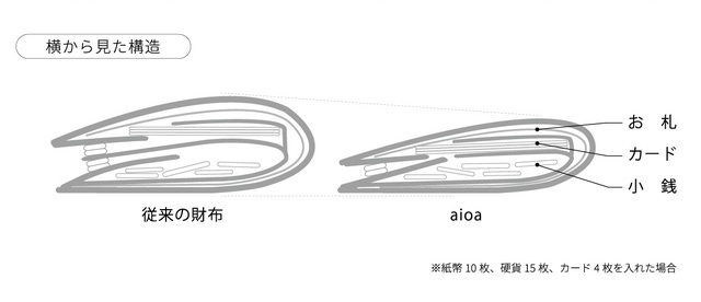 「aioa」は独自の構造により、持ち方を変えずにお札、小銭、カードの出し入れができるので会計時にもたつくことはありません。