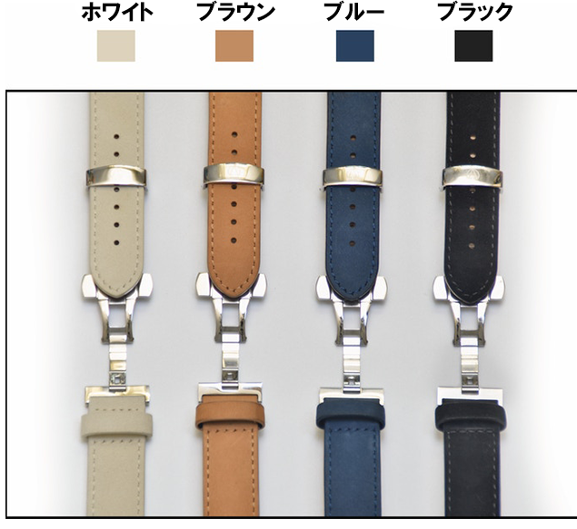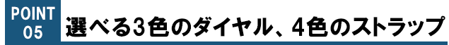 ダイヤルの色は、ブラック、ブルー、ホワイトの3種類。ストラップは、ブラック、ブルー、ブラウン、ホワイトの4種類。あなたのお好みの組み合わせが選べます。
