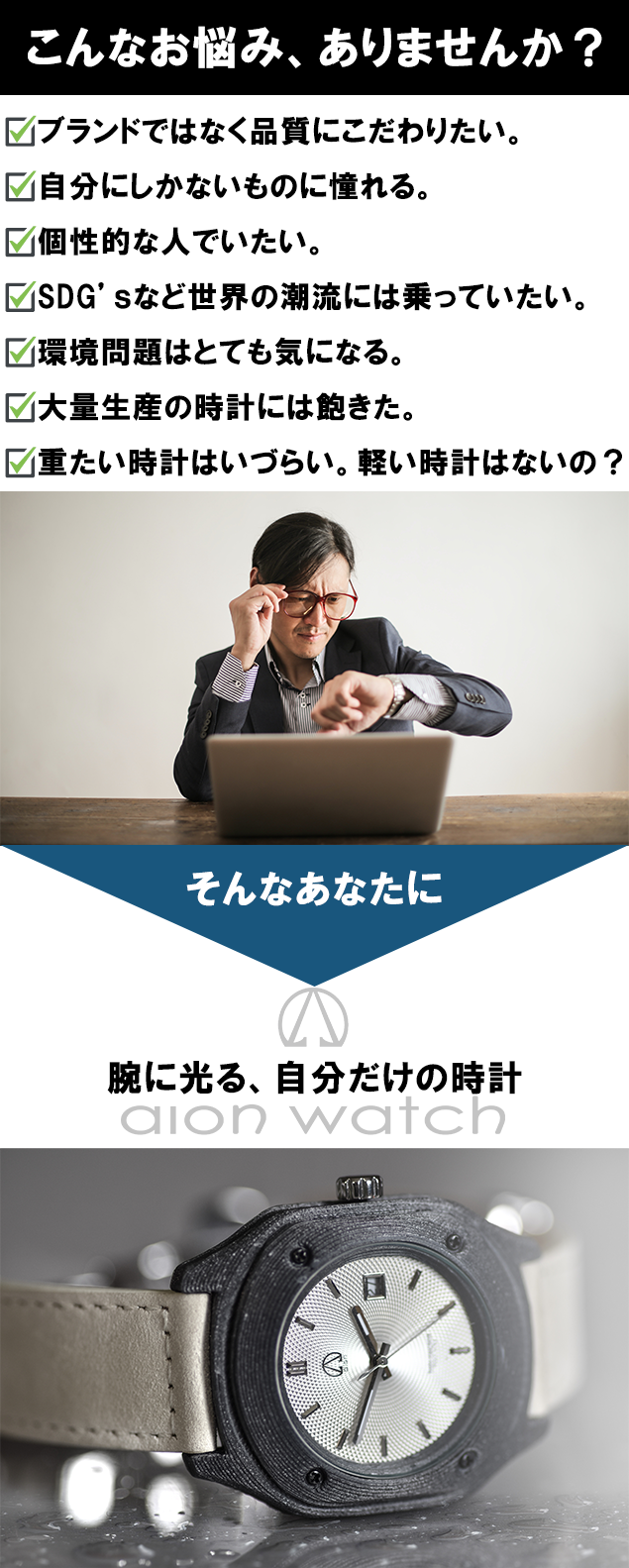 SDG’sや脱炭素が私たちの社会で大きな課題となっています。Aion Watchは、時代に敏感なあなたのための時計です。