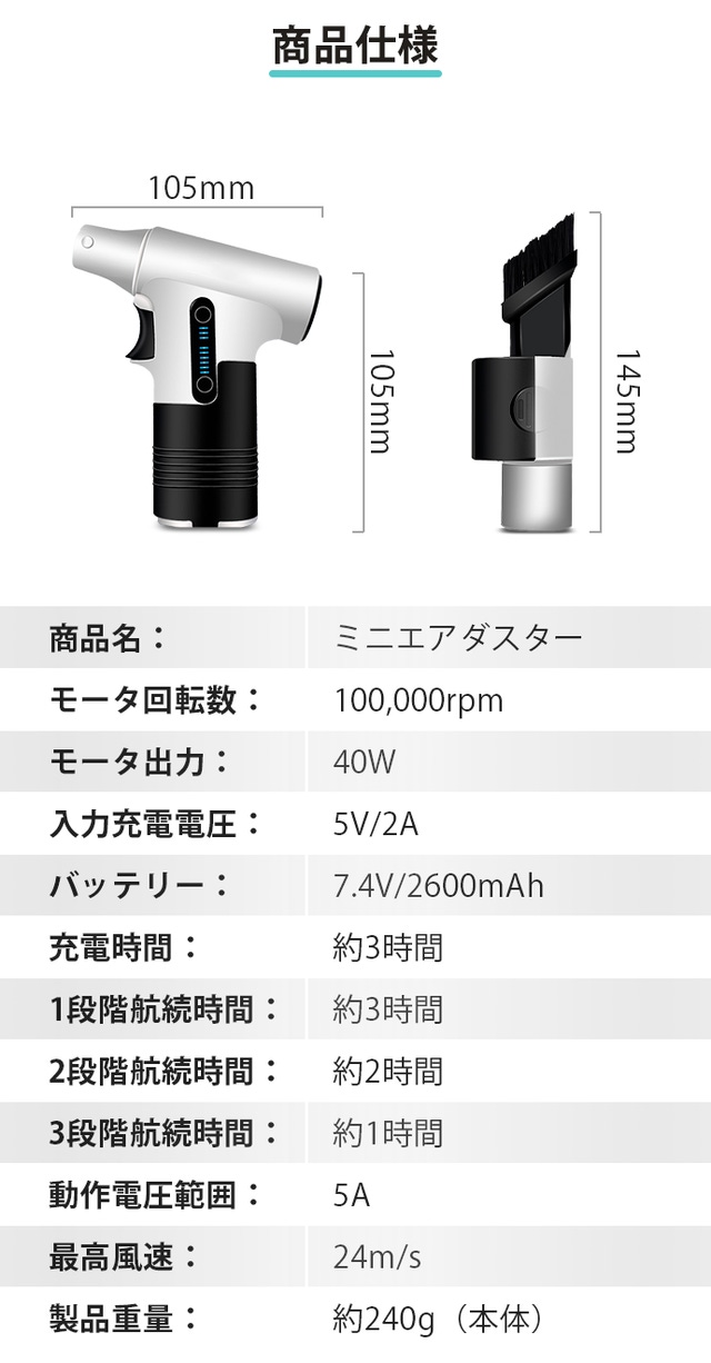 当社が今回お届けする「ミニエアダスター」は、さまざまなシーンで活躍する強力なドライヤーです。コンパクトですが、強力な風力を発揮してくれます。狭い隅のほこりも簡単にお掃除できますよ。