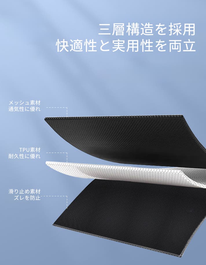 中間層には、環境に配慮したTPU素材を使用しています。柔軟性・耐久性に優れ、体圧をやさしく受け止めるようにサポートし、型崩れしにくい使用感を目指しました。さらに、裏面には滑り止め加工が施された素材を使用し、運転中のズレを防止します。安定した使用感を提供可能です。