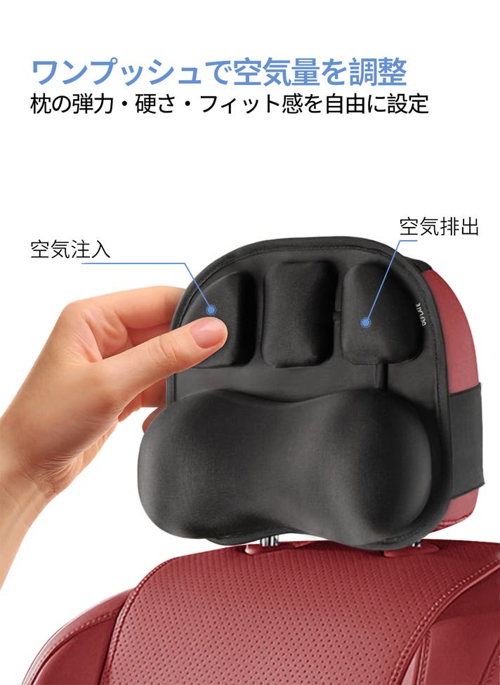 - 人間工学に基づいた設計で首元にフィット。ワンプッシュで空気量を調整し、好みの弾力に設定可能