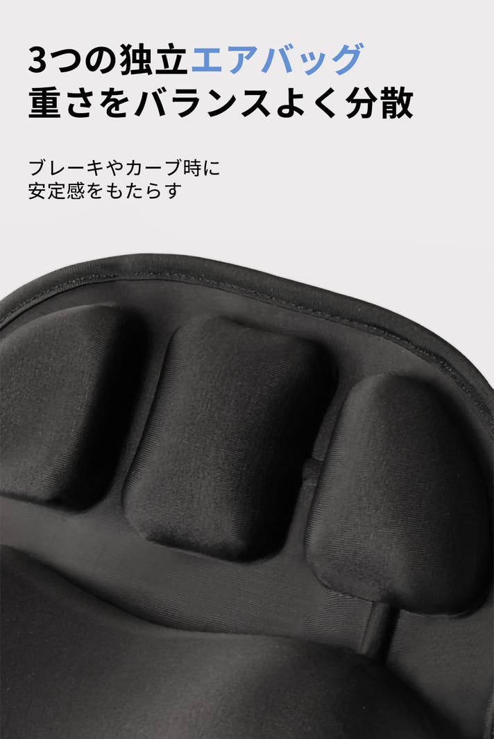 製品には上下2つの部分を設け、さらに頭部には3つの独立エアバッグを配置し、左右からやさしく包み込みながら、頭の重さをバランスよく分散します。ブレーキやカーブ時にも、頭がぐらつきにくく、安定感をもたらします。