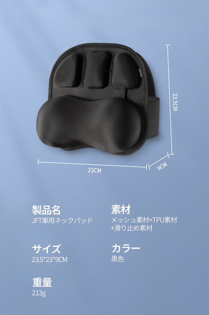 下部には大きなエアクッションを採用し、首元を優しく包み込むように支えることで、頭から肩にかけての荷重を全体に分散します。これにより、自然な姿勢を保ちながら長時間でも快適なドライブ環境を実現します。