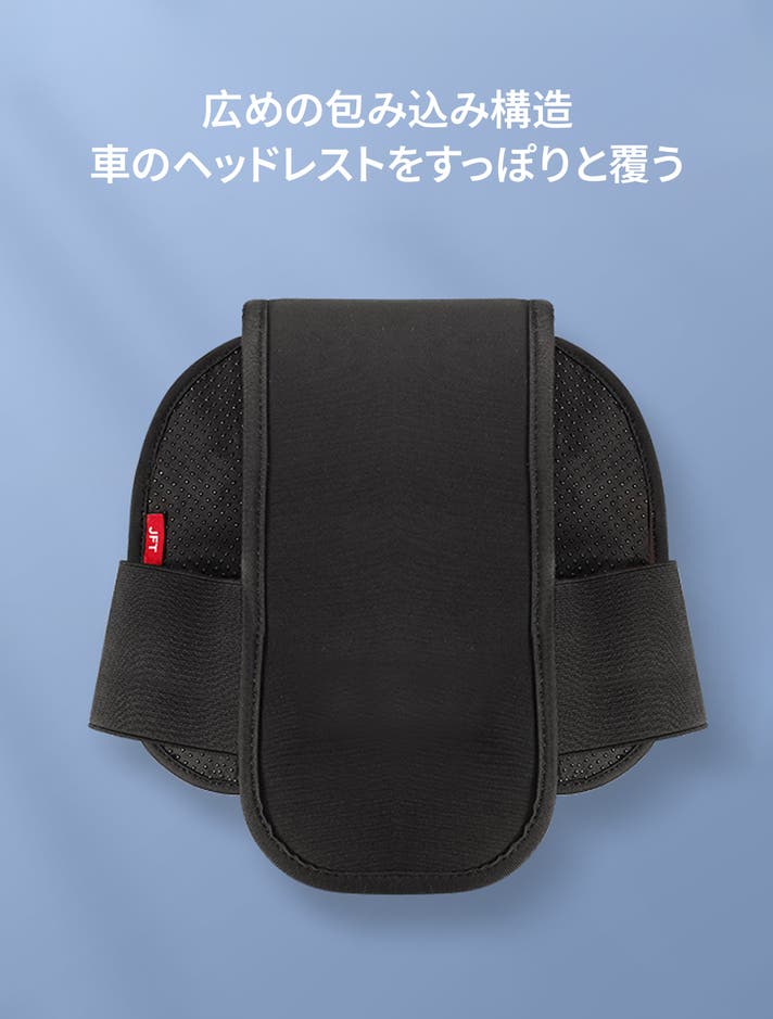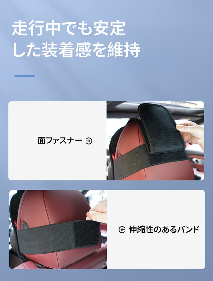 本ネックパッドは、広めの包み込み構造を採用し、車のヘッドレストをすっぽりと覆うフルカバー設計となっています。取り付け部分には面ファスナーと伸縮性のあるバンドを併用し、わずか数秒でしっかりと固定可能。ズレにくく、走行中でも安定した装着感を維持します。