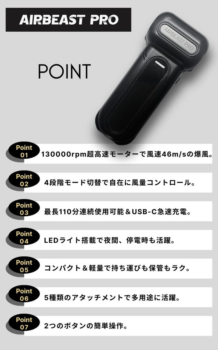 今回、ご紹介する「AIRBEAST PRO」は自宅、アウトドア、車の清掃など様々な状況に対応するハイパワーエアブロワです。コンパクトで軽量、どこにでも持ち運べる画期的な商品になります。是非皆様手に取って頂けたら幸いです。