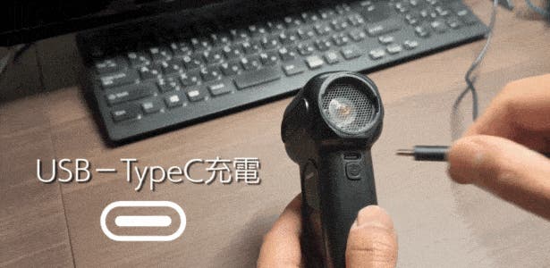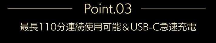 - 大容量バッテリー搭載、最長110分の連続使用可能。USB-TypC充電式でどこでも使える。