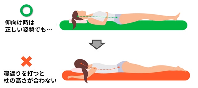 なぜなら、仰向けと横向きでは首や頭の高さが異なるからです。仰向けでピッタリ快適な枕でも、寝返りで横向きになると高さが合わず首や肩の筋肉に負担がかかります。