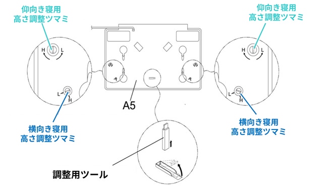本体の裏面にはツマミがあり、仰向き時と横向き時でそれぞれ高さを調整できます。(Hに回すほど高く、Lに回すほど低くなります)