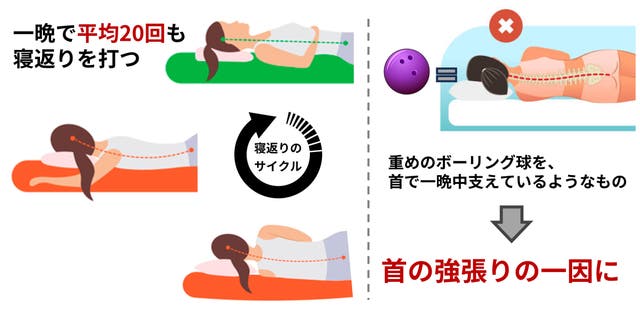 人は睡眠中の体圧分散や背中の体温調整のため一晩で平均20回も寝返りをしますが、実はそのたびに頭の高さが変わり首や肩の筋肉に負担がかかり続けます。