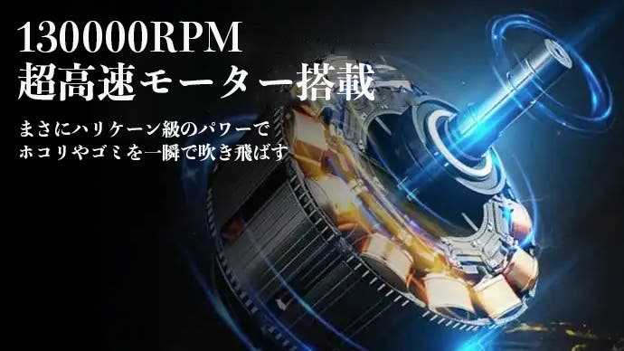 高性能ブラシレスモーターと13枚羽根を採用し、最高130000rpmを維持しつつ、安定した強風を提供。
