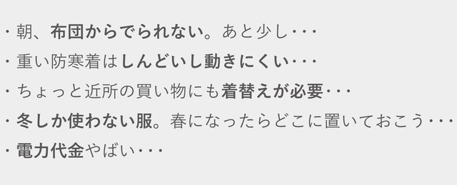 特に、冬の朝、布団からでて暖房をつけ部屋があたたまるまでは、「寒さ」を最も感じる時間。