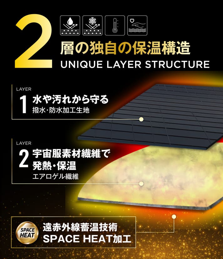 厚さわずか2mmで−195℃対応の宇宙服素材「エアロゲル生地」を応用。「S・KISTLER®エアロゲル綿」、そして遠赤外線蓄熱技術「SPACE HEAT」。この2つの先端テクノロジーが融合し、“冬でも暖房に頼らない”次世代の防寒体験を実現しました。