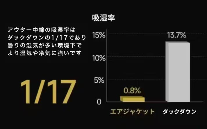 エアロゲル中綿は動物繊維を使わず細菌の繁殖を抑え、タックダウン特有の臭いもないです。さらに吸湿率がダウンのわずか1/17に過ぎず、湿気が多い環境下でも驚くほど暖かく快適です!
