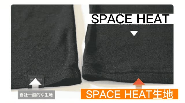SPACE HEAT技術で加工された生地と一般的な生地を29℃室内環境下で、ハロゲンランプで加熱する実験を行なっています。加熱開始してから約1分後、SPACE HEAT技術で加工された生地が有効的に熱を吸収し、表面温度をキープしていることが確認できます。(※自社従来品との比較)