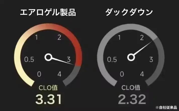 自社従来品のタックダウンに比べてエアロゲル製品のCLo値は3.31と格段にアップしております!暖かいジャケットは、人体から発熱する体温をいかに外気に放出しないかで、暖かさの性能が決まります。それを表す数値がCLo値です。
