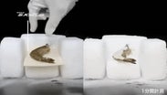 ドライアイスとエビの間に2mmのエアロゲルシートを挟み1分後の経過を観察する実験を行いました。※断熱性実験はSUPIELD・S.KISTLER試験室で行われたものです。