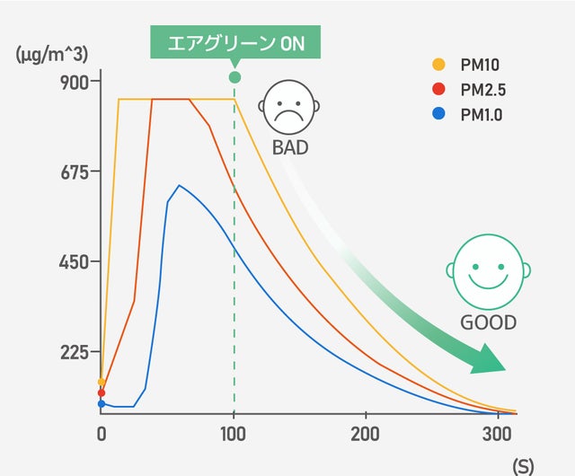 煙でぼやけて見えなかった密閉空間にエアグリーンを作動させると、急速に煙が減少し、空気がきれいになりました。
