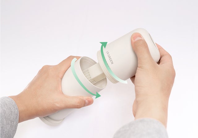 01. 本体の上部と下部を持ちながら、それぞれを反対側に回して開けます。