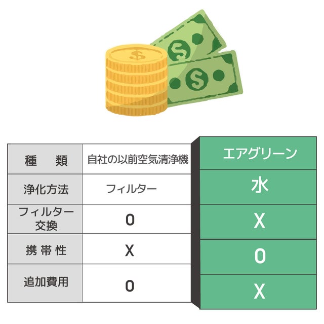 エアグリーンは水で空気をキレイにするため、毎回フィルターを購入する必要なく面倒なフィルター交換が一切不要です。エアグリーンは寿命が尽きるまで長く使えます。