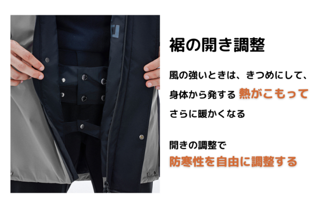 「機能性」や「デザイン性」がさらにバージョンUPし、従来の商品より丈を長くし、ウィンタースポーツ、アウトドアや普段着など様々なシーンにも対応するため、防寒性を調整できるように袖口や裾に調整機能を追加、また内側タブレットが入るぐらいのポケット搭載!