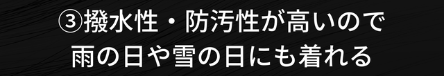 2. 撥水性・防汚性が高いので、雨の日や雪の日にも着れる!