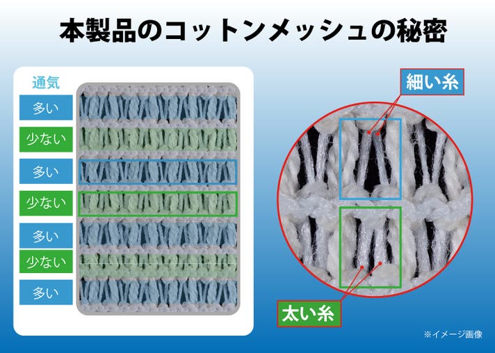 コットンメッシュ×ポリエステルメッシュの異素材2層構造。