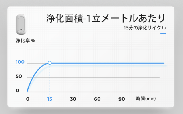 パーソナルな空間1㎥の空気をわずか15分・1サイクルで浄化可能です。(装置の回転スピードから推算した結果)