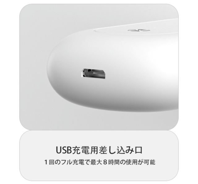 付属のUSBケーブルで簡単に充電することができます。1回の充電で最大8時間の使用が可能です。※電源プラグは付属しませんので、別途ご用意ください。