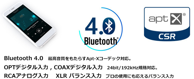 無線で簡単にアクセスできるブルートゥース4.0をサポート、さらにハイクオリティサウンドを約束するApt-Xコーデックもサポート。有線のデジタル入力は、CDを遥かに超える、24bit/192kHzのハイレゾ音源にも対応、有線、無線問わず、あらゆる音源を素晴らしい音質で再生します。