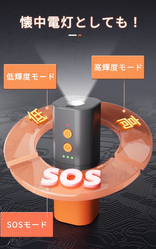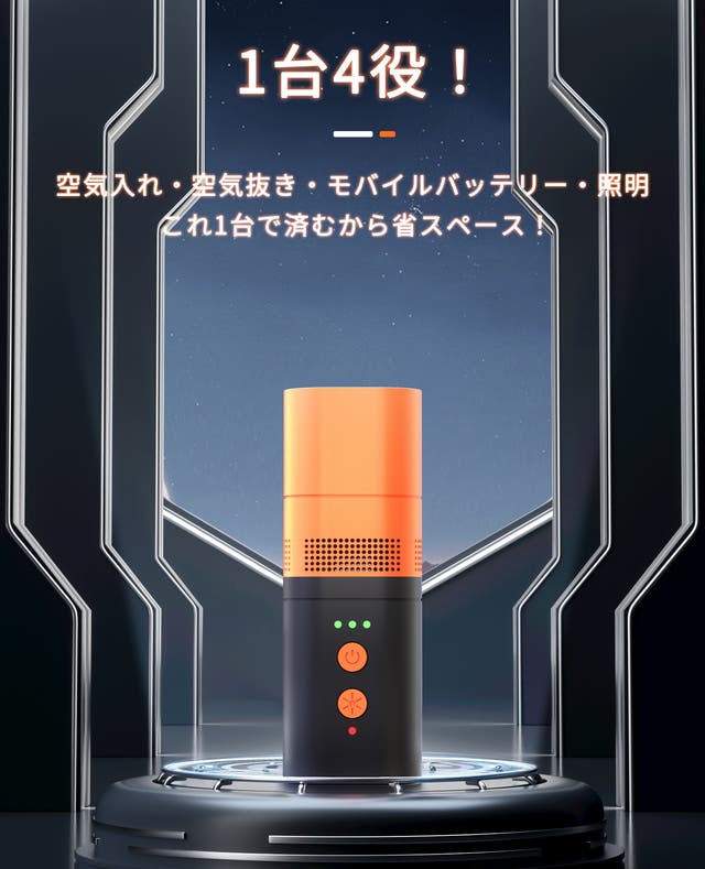 - 一台4役。空気入れ、空気抜き、懐中電灯、モバイルバッテリーの機能をこれ1台で!