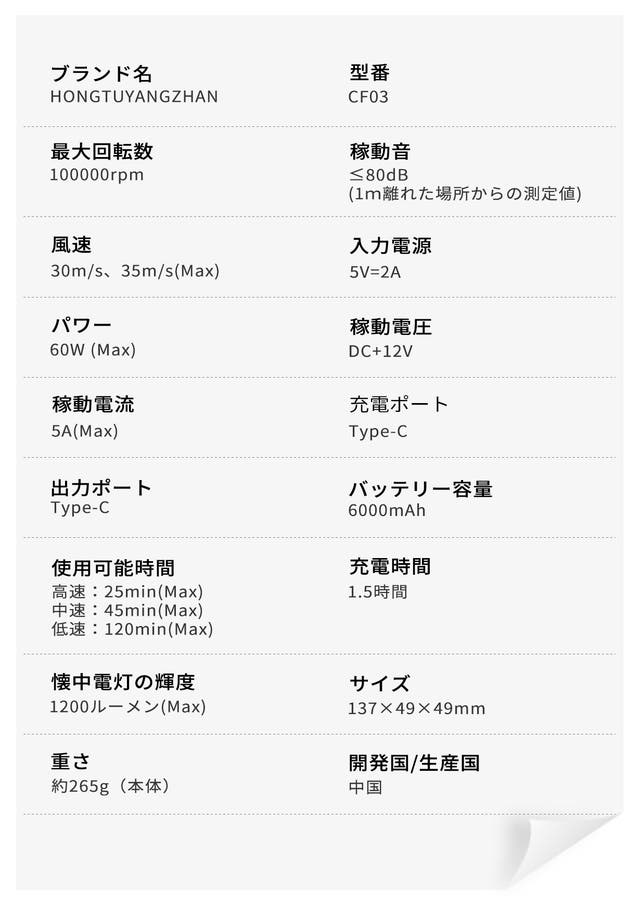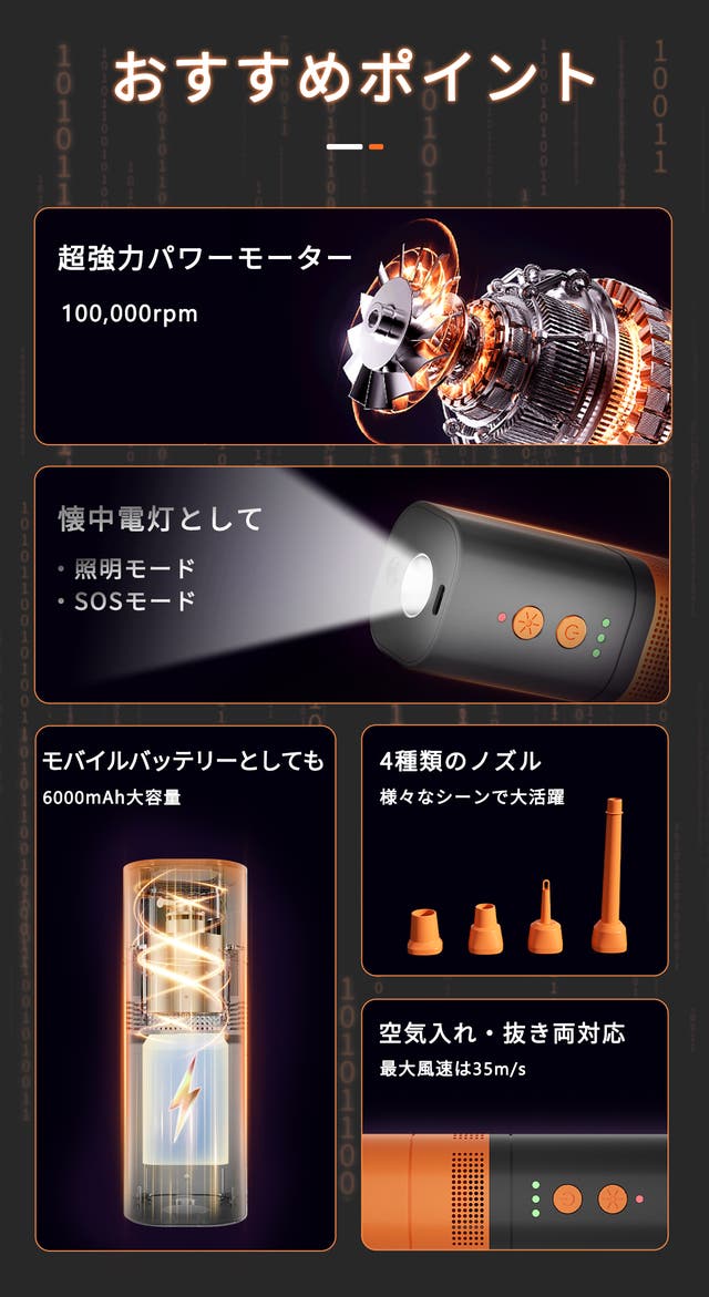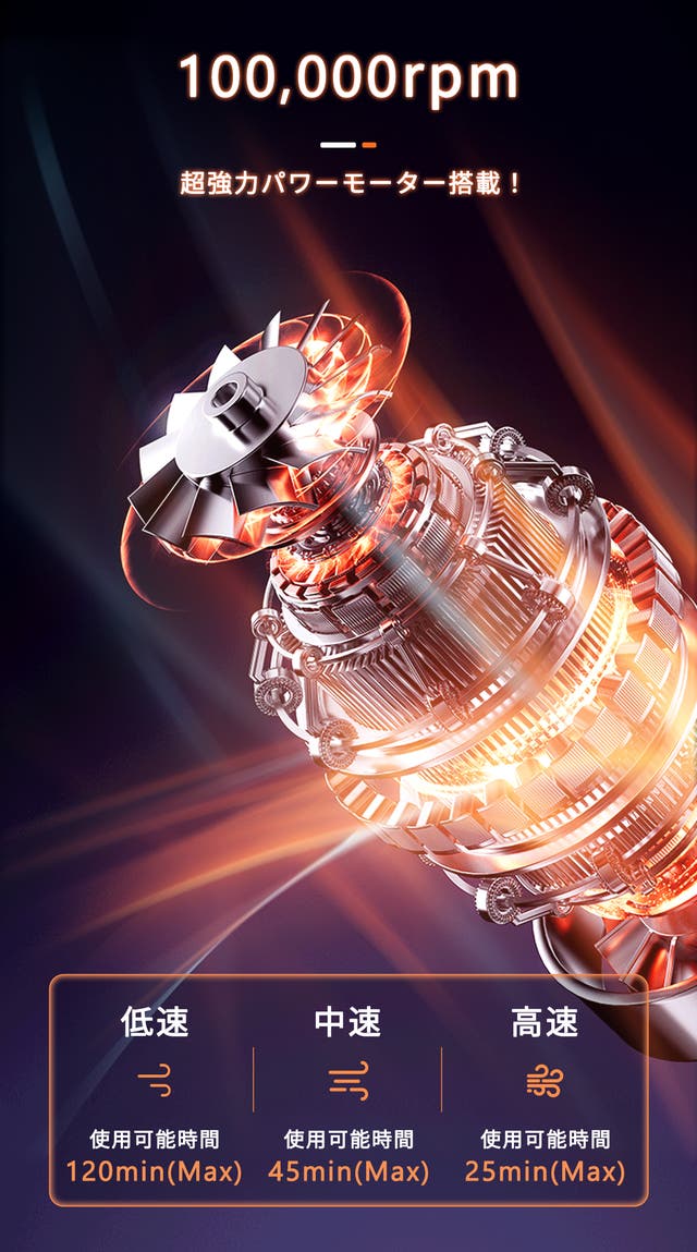 - 100,000rpmの超強力パワーモーターを搭載により、最大風速は驚きの35m/sに達します。