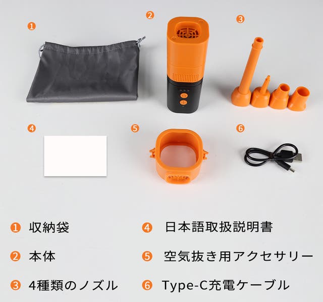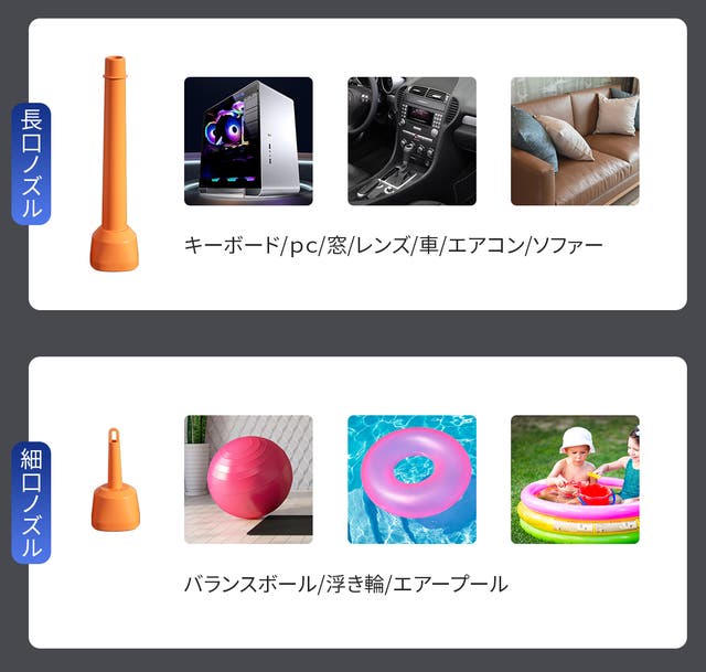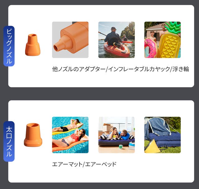 長口ノズル、細口ノズル、ビッグノズル、太口ノズルの4つのノズルが付属しています。日常生活で使う様々な物に空気を入れることができますので、キャンプなどのアウトドアレジャーでも1台あると大変便利です。